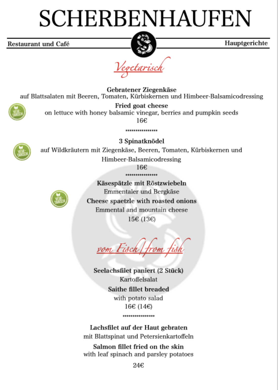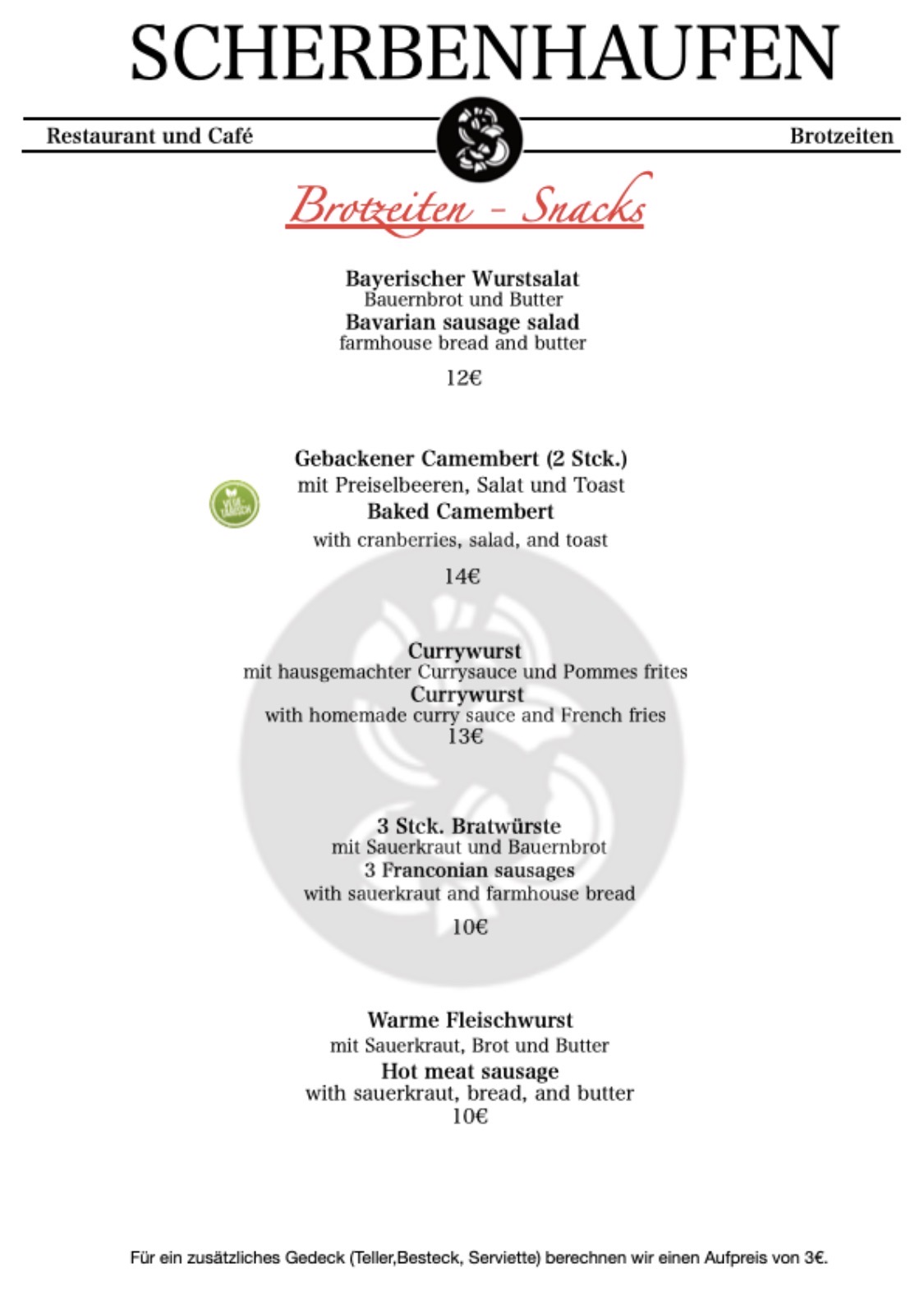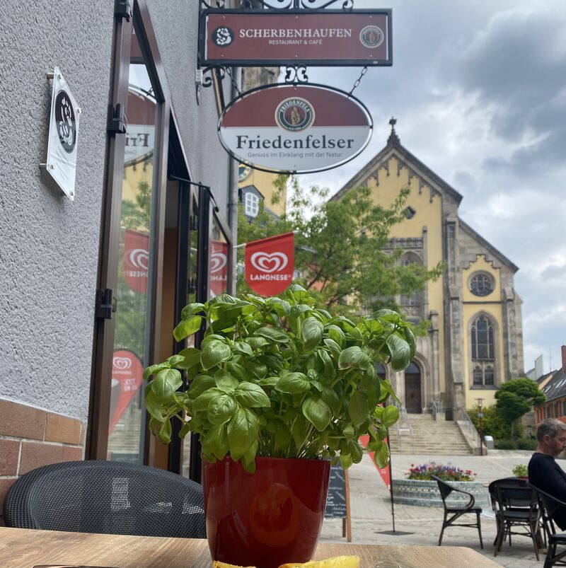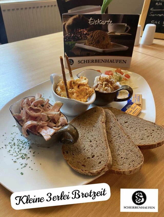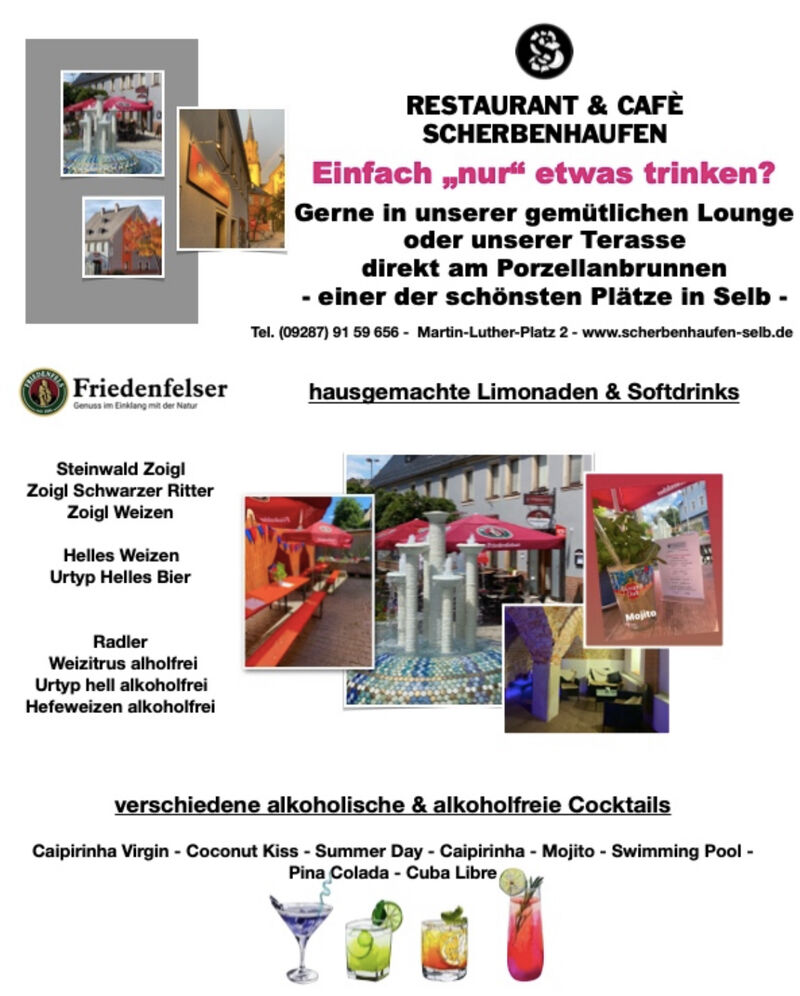 Das Porzellan hat in Selb eine lange Tradition - und damit verbunden auch der Scherbenhaufen. Daran angelehnt zeigt das Emblem des Restaurants Scherben von Tellern, die zu einem neuen Bild zusammen gesetzt wurden. Diese Philosophie steht auch hinter dem Konzept der Gastronomie, die regionale Partner unterstützt und alle Generationen an einen Tisch bringen möchte. Themen wie Nachhaltigkeit und auch soziale Verantwortung sind Werte, die durch das breit aufgestellte Speiseangebot des Scherbenhaufens auch an seine Gäste weiter gegeben werden sollen. Das Restaurant bietet stets wechselnde Gerichte für Mittags- und Abendtisch, selbstgebackene Kuchen und auch Snacks für zwischendurch. Die Produkte werden unter anderem von ortsansässigen Metzgereien, Gemüsehändlern, Fischereien und auch Landwirten bezogen, um den Gästen beste regionale Qualität servieren zu können.