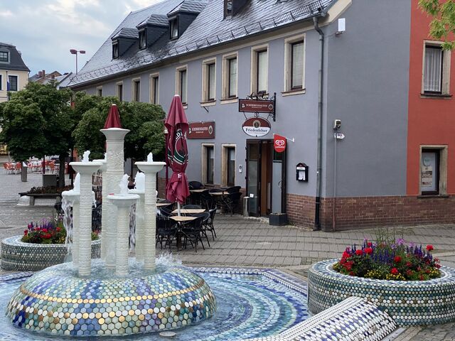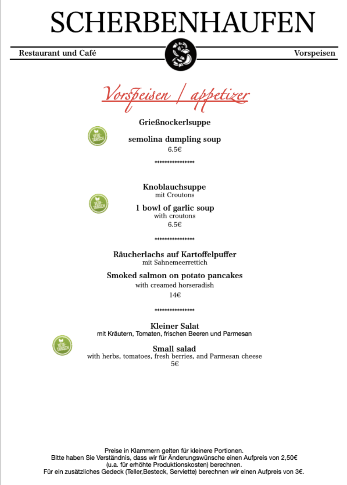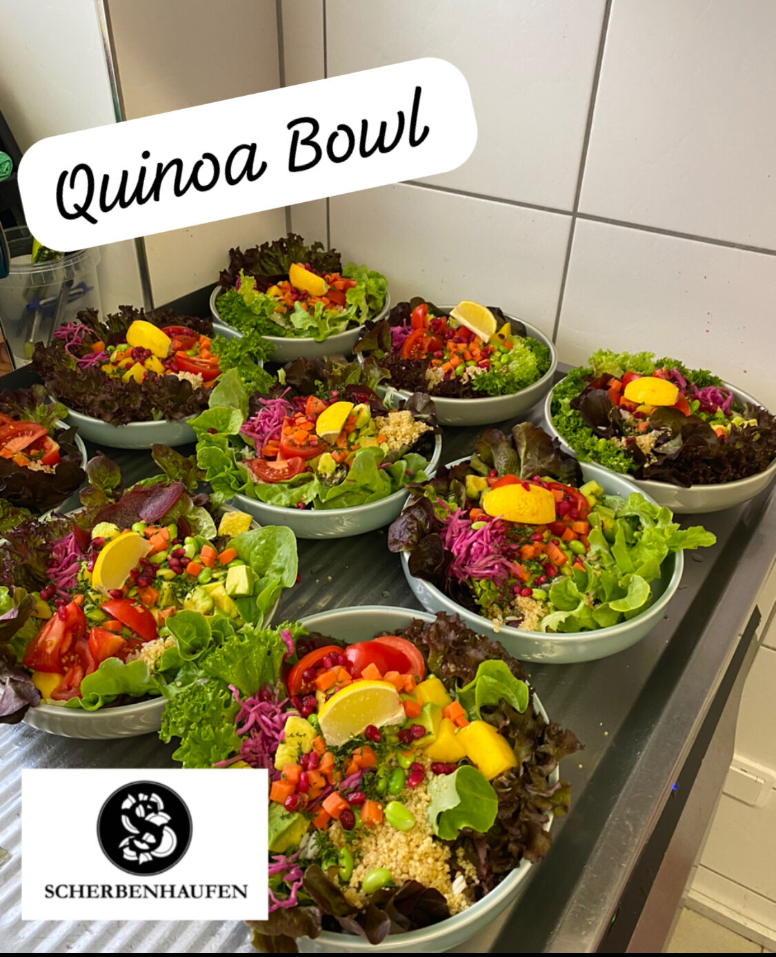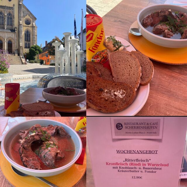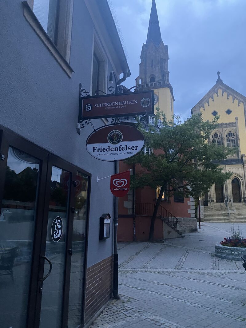 Das Porzellan hat in Selb eine lange Tradition - und damit verbunden auch der Scherbenhaufen. Daran angelehnt zeigt das Emblem des Restaurants Scherben von Tellern, die zu einem neuen Bild zusammen gesetzt wurden. Diese Philosophie steht auch hinter dem Konzept der Gastronomie, die regionale Partner unterstützt und alle Generationen an einen Tisch bringen möchte. Themen wie Nachhaltigkeit und auch soziale Verantwortung sind Werte, die durch das breit aufgestellte Speiseangebot des Scherbenhaufens auch an seine Gäste weiter gegeben werden sollen. Das Restaurant bietet stets wechselnde Gerichte für Mittags- und Abendtisch, selbstgebackene Kuchen und auch Snacks für zwischendurch. Die Produkte werden unter anderem von ortsansässigen Metzgereien, Gemüsehändlern, Fischereien und auch Landwirten bezogen, um den Gästen beste regionale Qualität servieren zu können.
