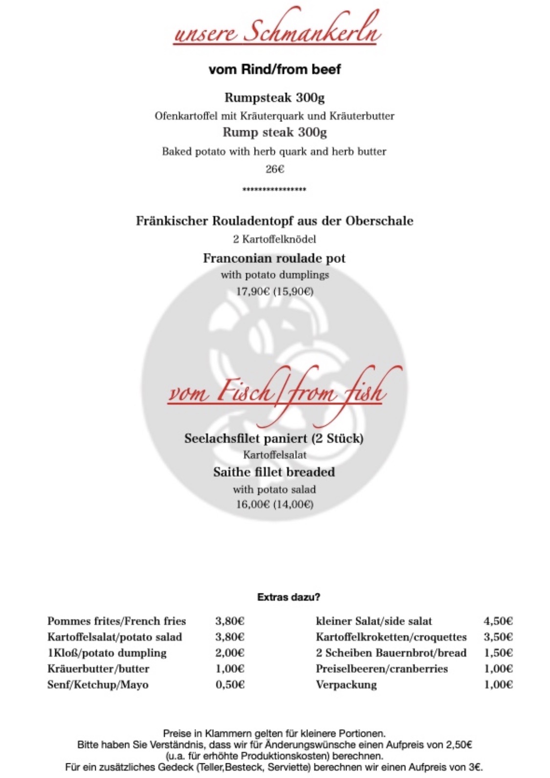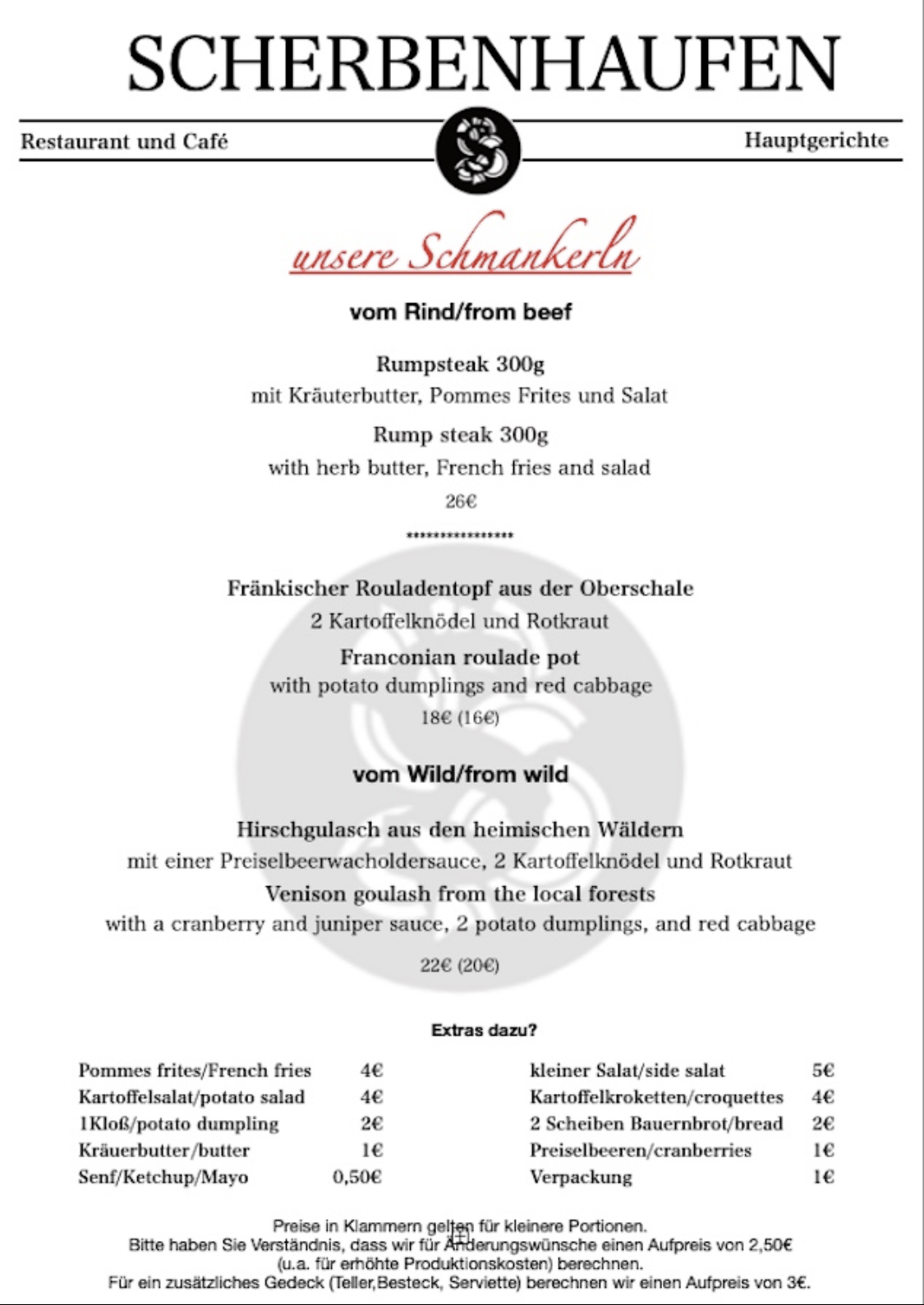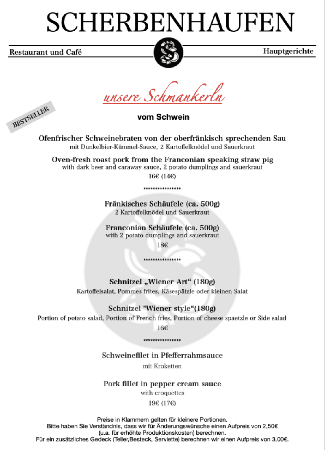 Wählen Sie aus einer Vielzahl von Gerichten der fränkischen Küche und lassen Sie sich begeistern. Hervorragende lokale Speisen und abwechslungsreiche regionale Gerichte erwarten Sie bei uns. Probieren Sie beispielsweise unsere begehrten Bestseller oder unsere XL Schäufele zu einem kalten Erfrischungsgetränk, einem guten Glas Wein oder einem erfrischenden Bier.